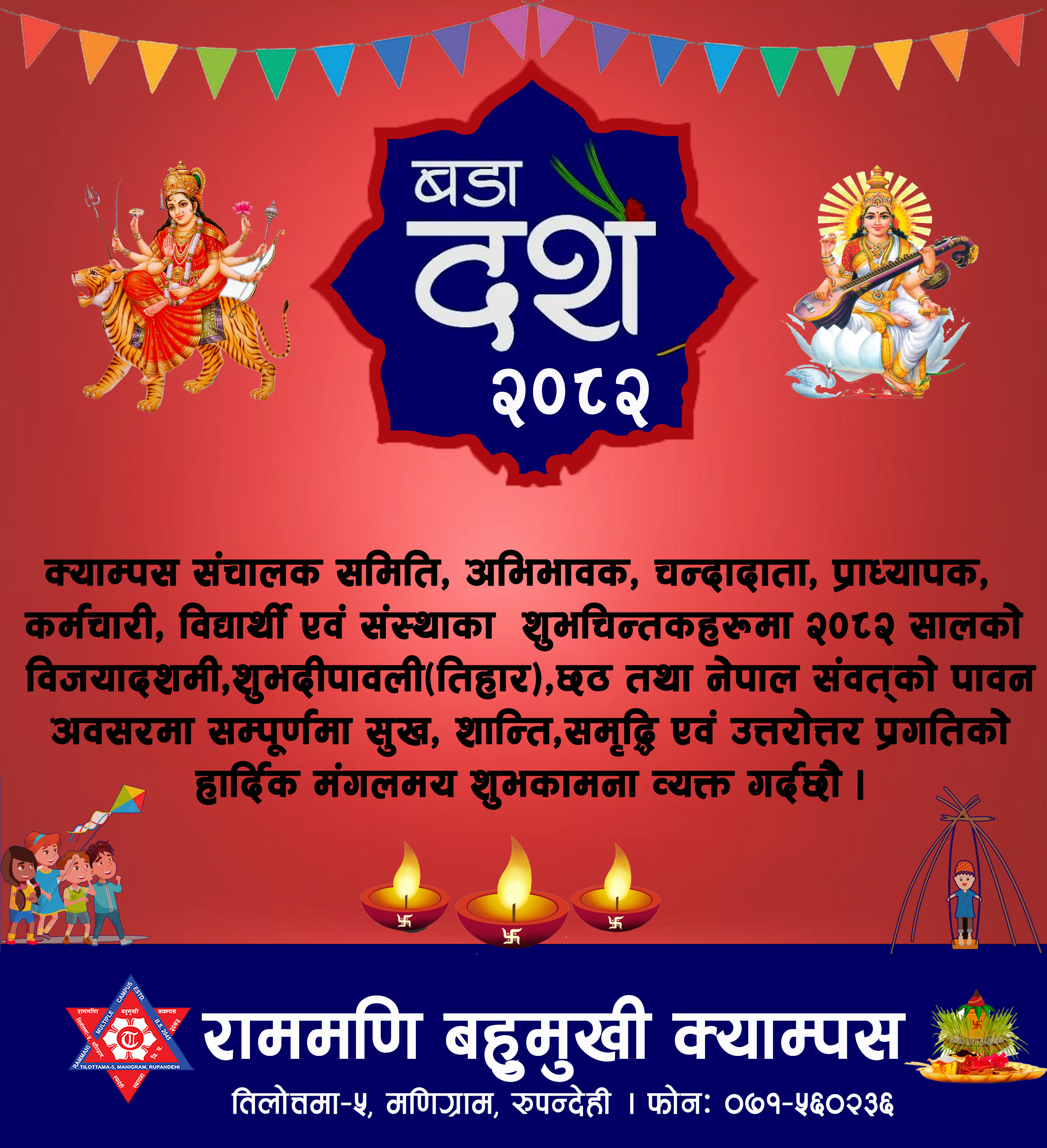 Rammani Multiple Campus is situated in the western part of Nepal, in Lumbini zone at Rupandehi District. It is 8 km south from Butwal Sub-Metropolitan City and 15 km north from Siddharthanagar (Bhairawa) Municipality. It is about 600m west to the Siddhartha Highway in the Tilottama Municipality-5, Manigram. This campus was established in 2045 B.S. Under T.U. by taking initiation by the social workers, educationists, local guardians, teachers, landlords, merchants etc. contributed to set up this campus.
