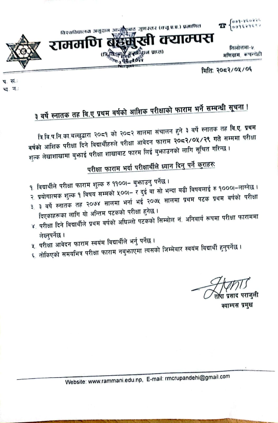 Notice August 22, 2025 ३ वर्षे स्नातक तह वि.ए. प्रथम वर्षको आंशिक परीक्षाको फारम भर्ने सम्बन्धी सूचना ।