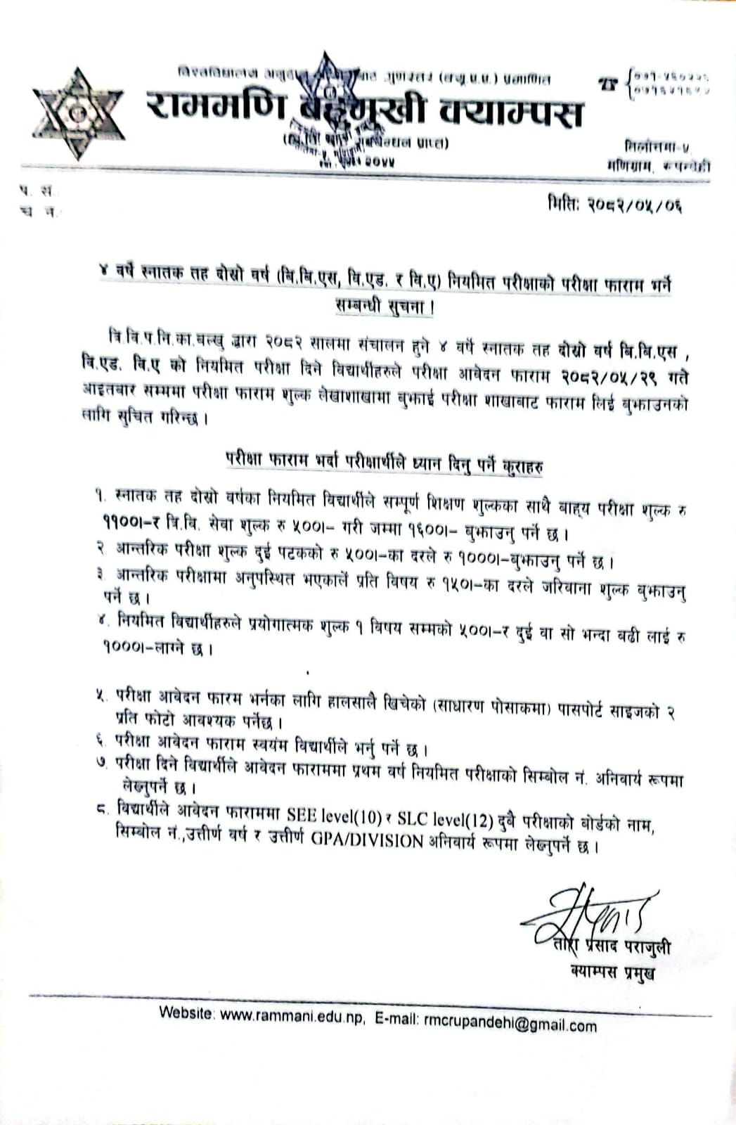 Notice August 22, 2025 ४ वर्षे स्नातक तह दोस्रो वर्ष (बि.बि.एस, वि.एड. र वि.ए.) नियमित परीक्षाको परीक्षा फारम भर्ने सम्बन्धी सूचना ।